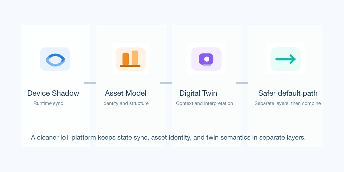 更稳的默认路线是:用 Device Shadow 解决同步和状态镜像,用 Asset Model 解决稳定身份与业务归属,再在高价值场景上叠加 Digital Twin 做上下文解释和协同操作。 先分层,再组合,平台才能同时保持状态链路轻、资产链路稳、业务链路清。