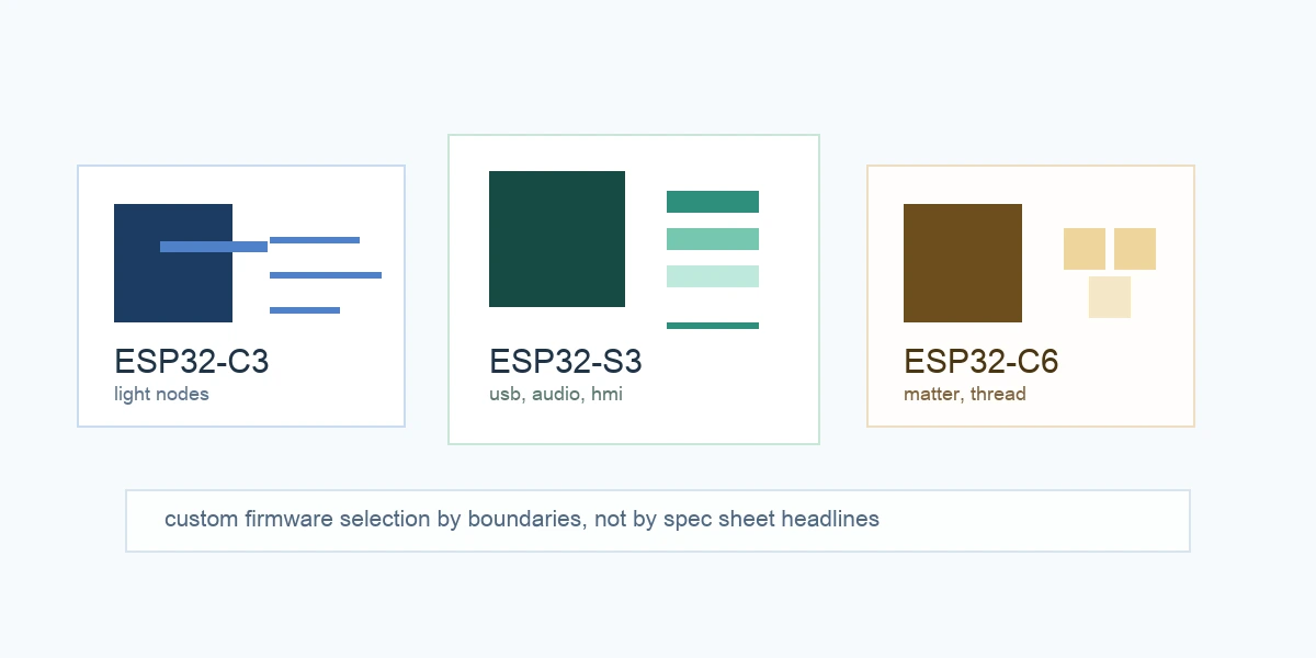 ESP32-C3、ESP32-S3、ESP32-C6 最值得比较的,不是谁“参数更好看”,而是谁更适合你的产品边界。对大多数定制固件项目来说,真正的选型顺序应该是: