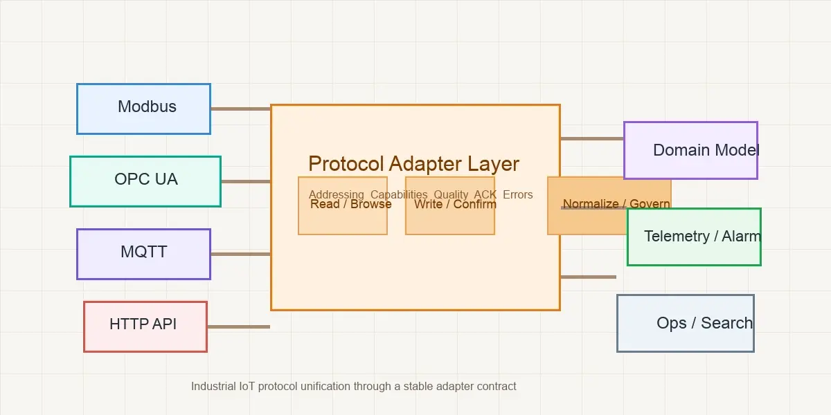 Modbus、OPC UA、MQTT、HTTP等多种接入方式时,最值得统一的不是 payload,而是工程边界。只有把寻址、能力、质量、错误与命令确认收敛成同一套适配层契约,平台上层才可能真正做到协议可替换、对象可治理、命令可审计。